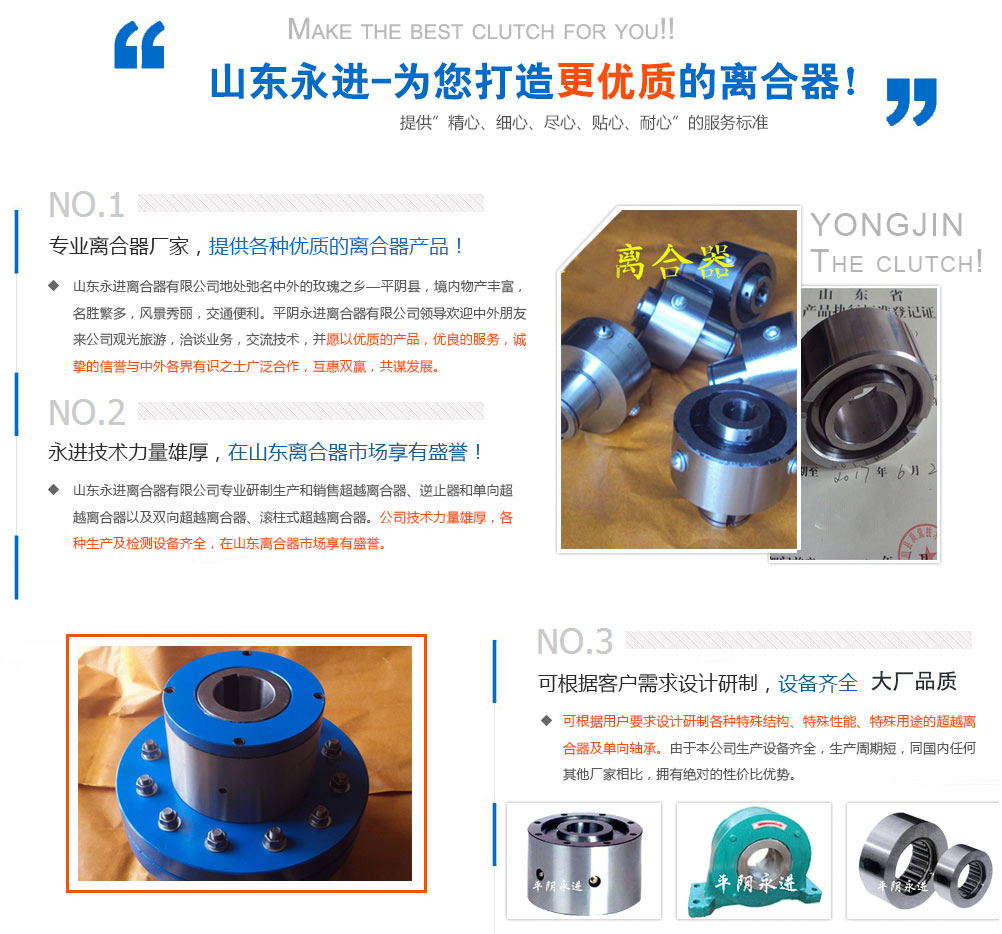 山東永進(jìn)離合器有限公司地處平陰縣,主營(yíng)各類(lèi)離合器的銷(xiāo)售生產(chǎn)與研發(fā),產(chǎn)品種類(lèi)有單向離合器、雙向離合器、超越離合器、單向超越離合器、雙向超越離合器等產(chǎn)品,在山東離合器市場(chǎng)享有盛譽(yù),工廠技術(shù)力量過(guò)硬,工藝嚴(yán)謹(jǐn),各道工序配有專(zhuān)職檢驗(yàn)人員。設(shè)備精良、產(chǎn)品具有高精度、高運(yùn)轉(zhuǎn)性、低噪音、低振動(dòng)、低摩擦力、高密封性、長(zhǎng)壽命等性能。廣泛應(yīng)用于礦機(jī)設(shè)備、輸送設(shè)備、減速機(jī)、節(jié)能設(shè)備、紡織機(jī)械、印刷機(jī)械、自動(dòng)生產(chǎn)線等行業(yè)。產(chǎn)品銷(xiāo)往國(guó)內(nèi)。 工廠位于弛名中外的玫瑰之鄉(xiāng)---平陰縣境內(nèi),平陰縣物產(chǎn)豐富,風(fēng)景秀麗,交通方便。公司領(lǐng)導(dǎo)歡迎中外朋友來(lái)公司觀光旅游,洽談業(yè)務(wù),交流技術(shù),并愿以過(guò)硬的產(chǎn)品,優(yōu)良的服務(wù),誠(chéng)摯的信譽(yù)與中外各界有識(shí)之士廣泛合作,互惠雙贏,共謀發(fā)展。“本宗”超越離合器及軸承以“向用戶(hù)提供信得過(guò)的產(chǎn)品和服務(wù)”為根本宗旨,努力滿(mǎn)足您的要求,與您共創(chuàng)事業(yè)輝煌。公司部分產(chǎn)品如下:1、CKA型、CKB型、CKC型、CKE型主要...