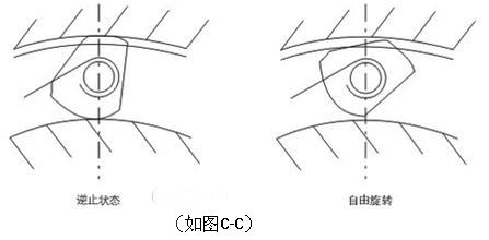 此型設計之特點為楔塊固定于楔塊保持架中,楔塊保持架與超運轉速度之環(huán)體(如內環(huán)或外環(huán))結合。與內環(huán)或外環(huán)結合的楔塊保持架及楔塊轉動時會產生離心力,此離心力會抵消或大于楔塊彈簧的力量,從而使楔塊以離心力的方向重新旋轉一個角度,而使旋轉之內環(huán)和外環(huán)與楔塊保持一個無接觸的位置,克服了離合器高速。(如圖C-C)