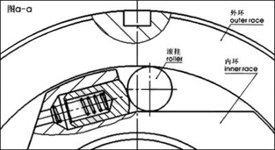 滾柱式單向離合器為外環(huán)與內環(huán)之間以圓柱形滾子支撐,而內環(huán)安裝有彈簧及頂銷,由頂銷產生一個持續(xù) 的推力,將滾柱往外擠壓便構成了外環(huán)、內環(huán)及滾柱的接觸結構如下圖,由于滾柱與內環(huán)、外環(huán)的接觸為持續(xù)不間斷的,故可立即的反應與傳輸扭矩力。此種滾柱型設計堅固耐用、可靠性高,可適用各種應用范圍。例如超運轉速度離合器、定位離合器或防止逆轉離合器。(如圖a-a)